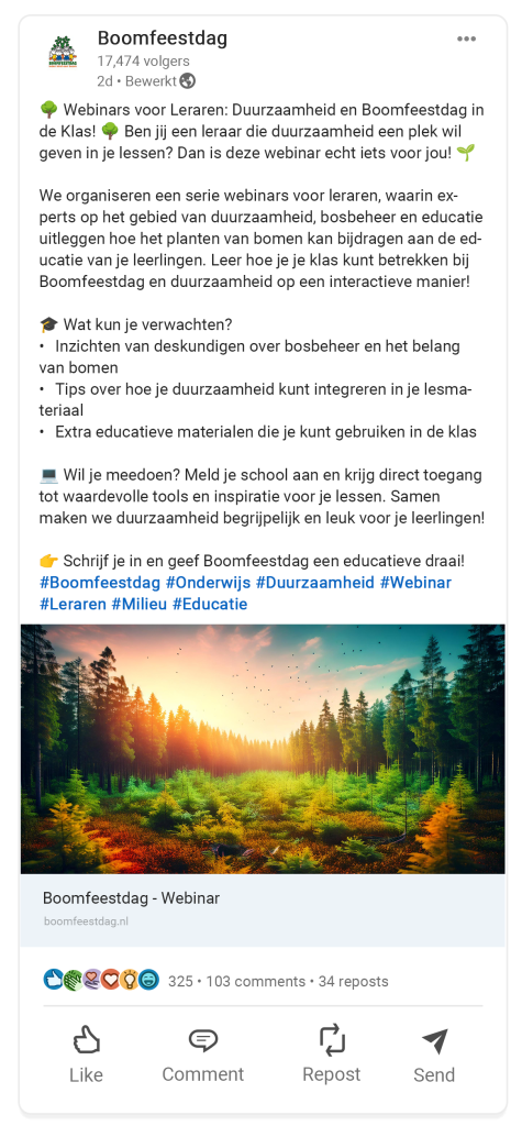 Gemaakt werk: Voor Boomfeestdag ontwikkelde ik een LinkedIn-post om webinars voor leraren te promoten. Ik maakte een visueel ontwerp waarin een boek transformeert in bomen, als symbool voor de verbinding tussen kennis en natuur. Dit ontwerp werd gegenereerd met behulp van AI en sluit aan bij de educatieve boodschap van duurzaamheid en bosbeheer. De bijbehorende tekst benadrukte de voordelen van de webinars en riep scholen op om deel te nemen. Door het combineren van creatieve storytelling en technologie creëerde ik een professionele en aansprekende campagne die perfect aansluit bij de doelgroep.